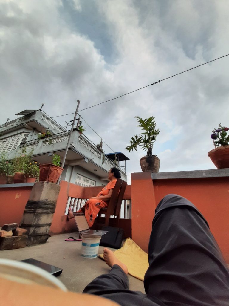 She sweetly complains [in newari], “What’s that song saying anyway [tries imitating the music] ? Is the song even good at all? We’ve good music here than the ones made in America. [laughs]”. Followed by a subtle, out-of-the-bloom inquiry, “Where’s your girlfriend from? [haha]”